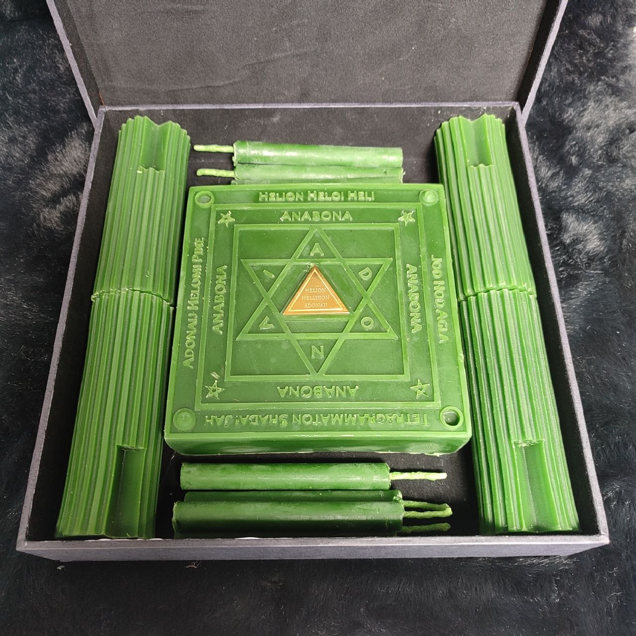 Este Almadel é um instrumento ritual feito de cera de abelhas tingida de verde, com quatro suportes para velas, dezesseis velas, um turibulo de argila, recomendados no sistema do Lemegeton como base para operações de invocação e comunicação com espíritos das alturas celestiais.