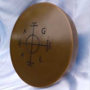 Este Almadel é um instrumento ritual feito de cera preta (outono), com quatro suportes para velas, dezesseis velas, um turibulo de argila, recomendados no sistema do Lemegeton como base para operações de invocação e comunicação com espíritos das alturas celestiais.